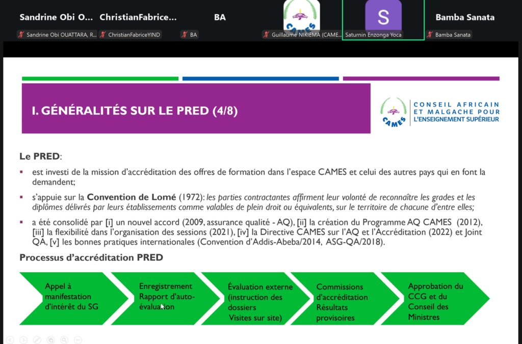 Dans le cadre du lancement de la 41ème session du Programme Reconnaissance et Équivalence des Diplômes (PRED 2025), le Conseil Africain et Malgache pour l’Enseignement Supérieur (CAMES) a organisé, le mercredi 4 février 2025, de 09h30 à 12h30 (GMT), un atelier virtuel de renforcement des capacités à destination des personnes ressources des Institutions d’Enseignement Supérieur et de Recherche (IESR) dans le cadre du processus d’accréditation.