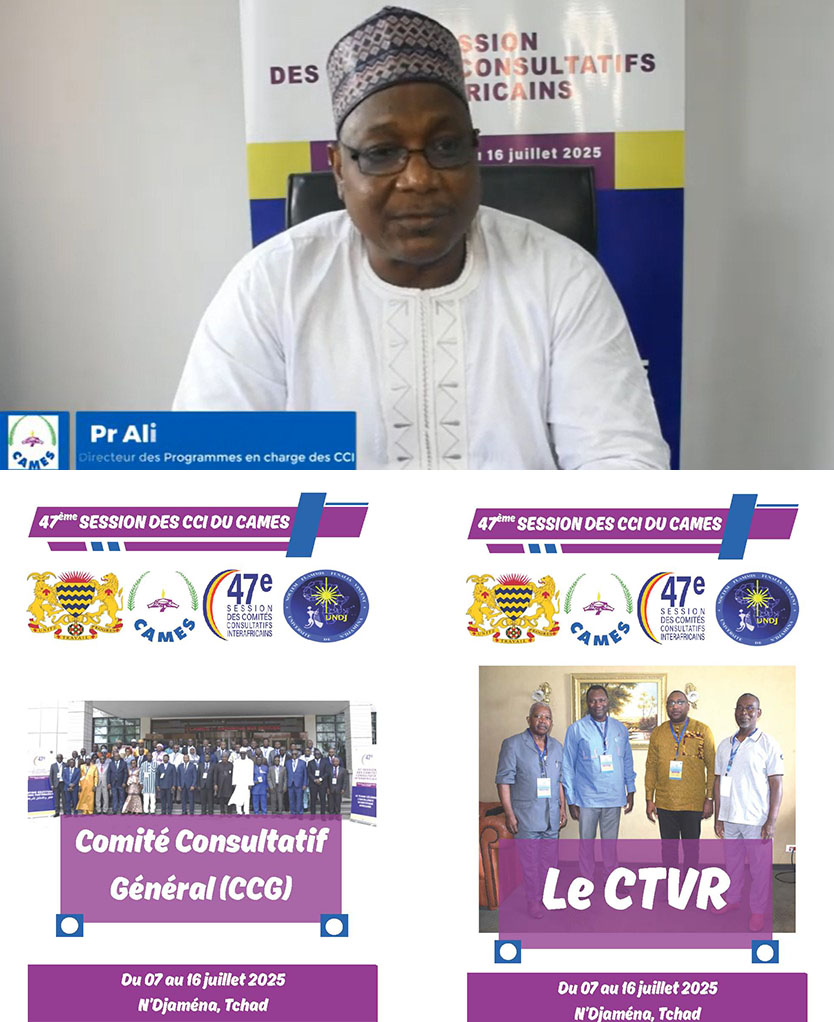 La 47ème session des Comités Consultatifs Interafricains (CCI) du CAMES, s’est tenue du 7 au 16 juillet 2025, à N’Djaména au Tchad. Près de 250 participants : Experts, membres des Instances du CAMES et du Secrétariat général, y ont activement pris part à travers les travaux des Comités Techniques Spécialisés, la réunion ordinaire du Comité Consultatif Général et les cérémonies solennelles organisées. Nous vous invitons à revivre cet évènement phare à travers quelques interviews et des éléments audiovisuels.