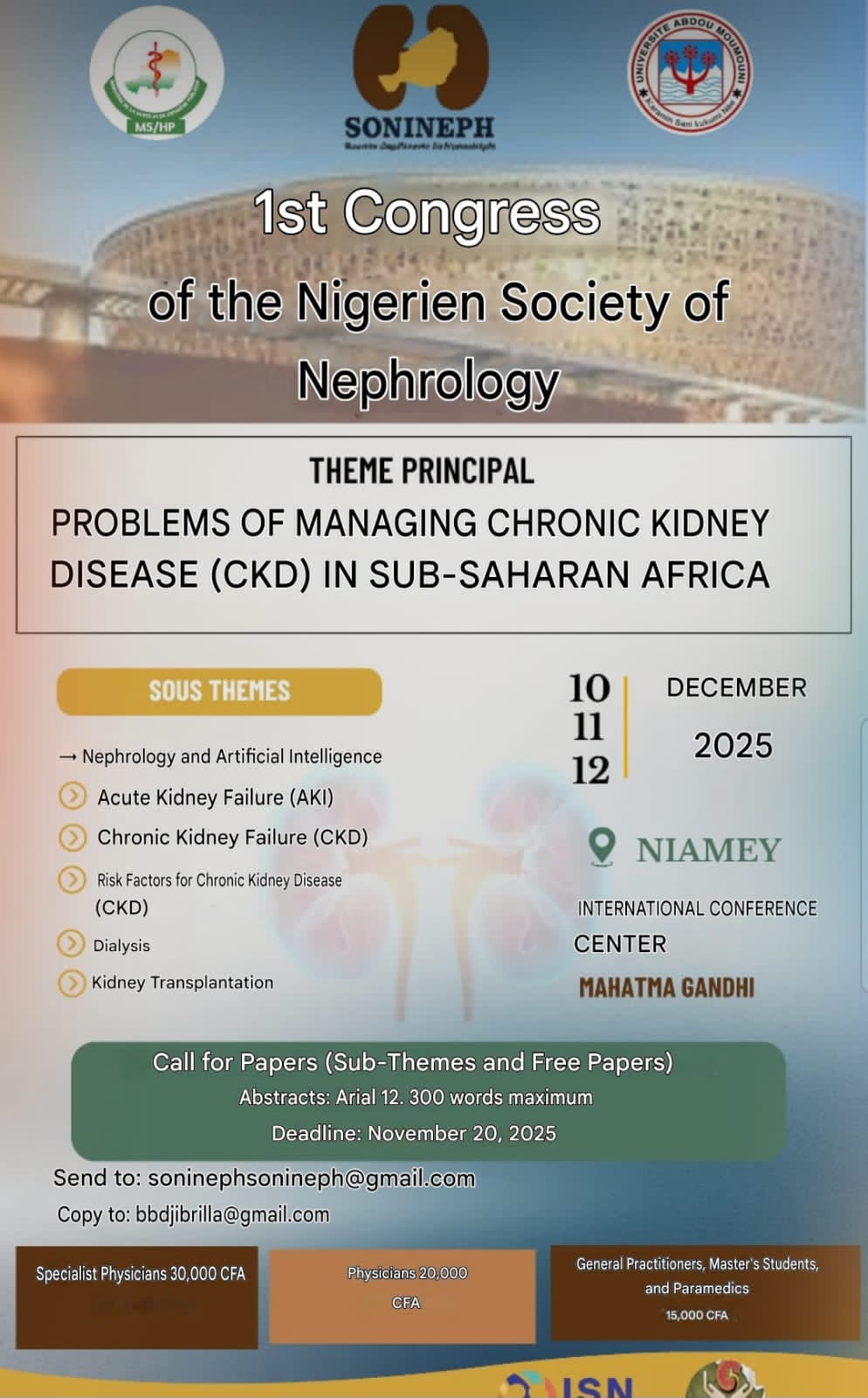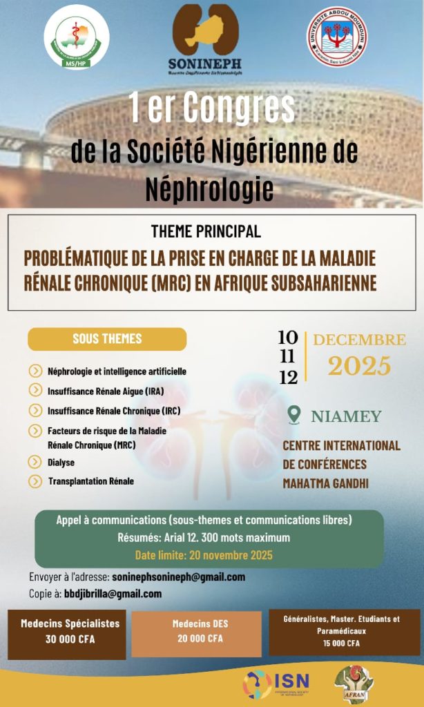 Le 1er congrès de la Société Nigérienne de Néphrologie se tiendra du 10 au 12 décembre 2025, au Centre International de Conférences Mahatma Gandhi de Niamey (Niger) sous le thème : « problématique de la prise en charge de la maladie rénale chronique (MRC) en Afrique subsaharienne ».