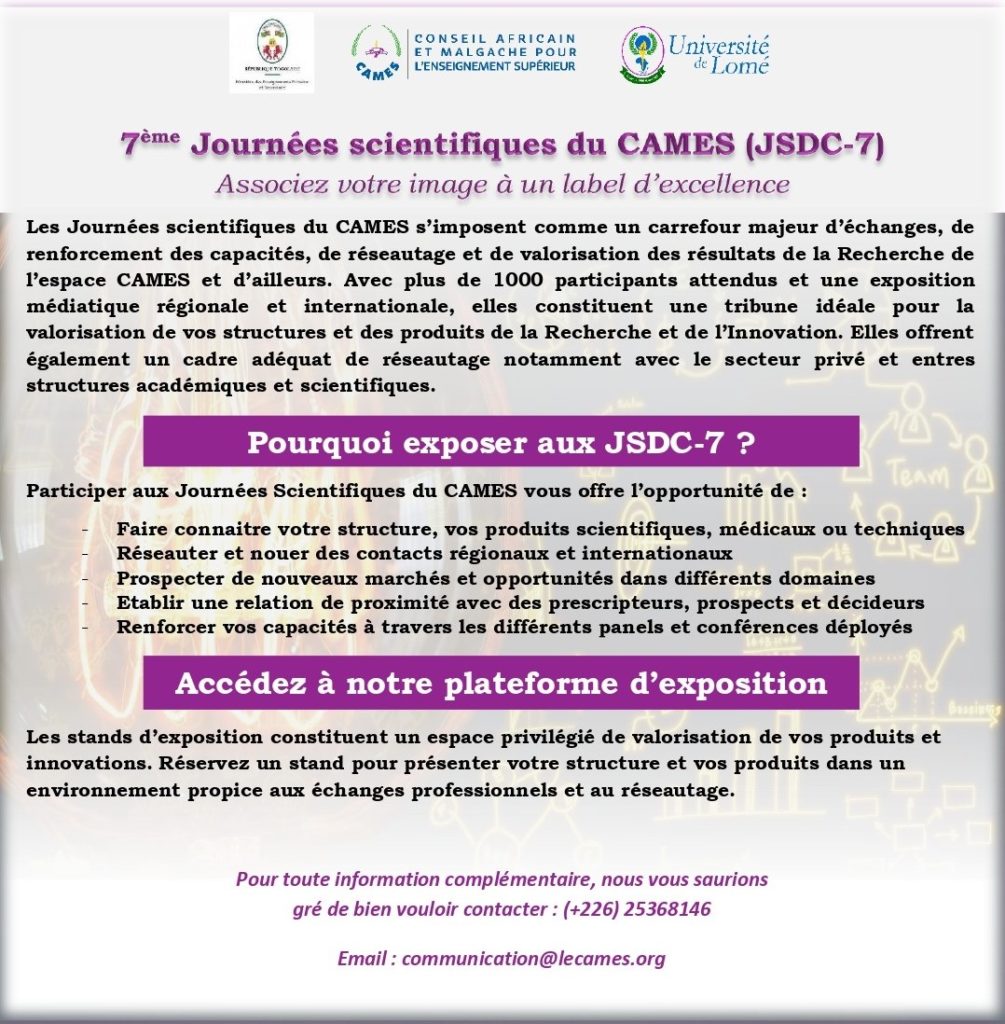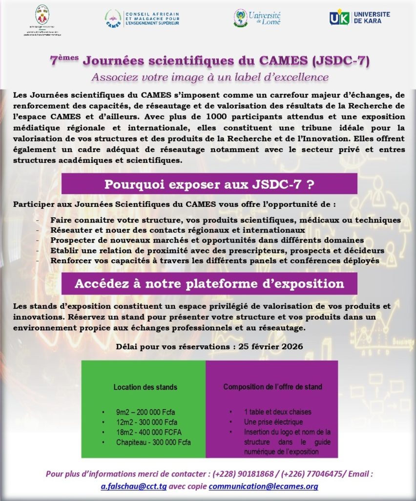 Le Conseil Africain et Malgache pour l’Enseignement Supérieur (CAMES), en partenariat avec le Ministère de l’Éducation nationale de la République du Togo, organise du 9 au 12 mars 2026 à Lomé, la 7ème édition des Journées Scientifiques du CAMES (JSDC-7). Ces Journées Scientifiques sont un rendez-vous bisannuel de référence qui offre un cadre privilégié d’échanges, de renforcement des capacités, de réseautage et de valorisation des résultats de la Recherche.