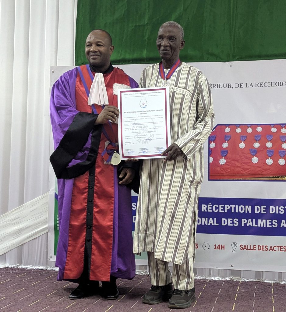 Professeur Sita GUINKO, Professeur Titulaire de Botanique et Biologie végétale de l’Université Joseph KI-ZERBO, Enseignant depuis 1974 et retraité depuis 2002, a partagé son parcours et toute la satisfaction qui l’anime en ce jour particulier, au micro de la presse. En effet, 48 Docteurs scientifiques sont passés sous l’encadrement de ce pionnier de l’Enseignement. Il a été fait Commandeur dans l’Ordre International des Palmes Académiques, lors de cette cérémonie solennelle. « Cette distinction constitue un honneur très remarquable. Elle représente une reconnaissance du CAMES pour ma participation à ses différents Programmes dont la Pharmacopée et Médecine Traditionnelles ou encore le PRED. ». Il avait également été élevé au grade de Commandeur de l’Ordre des Palmes Académiques, le 8 décembre 2025, par l’Université Joseph KI-ZERBO, à l’occasion des cinquante (50) ans de l’Institution.