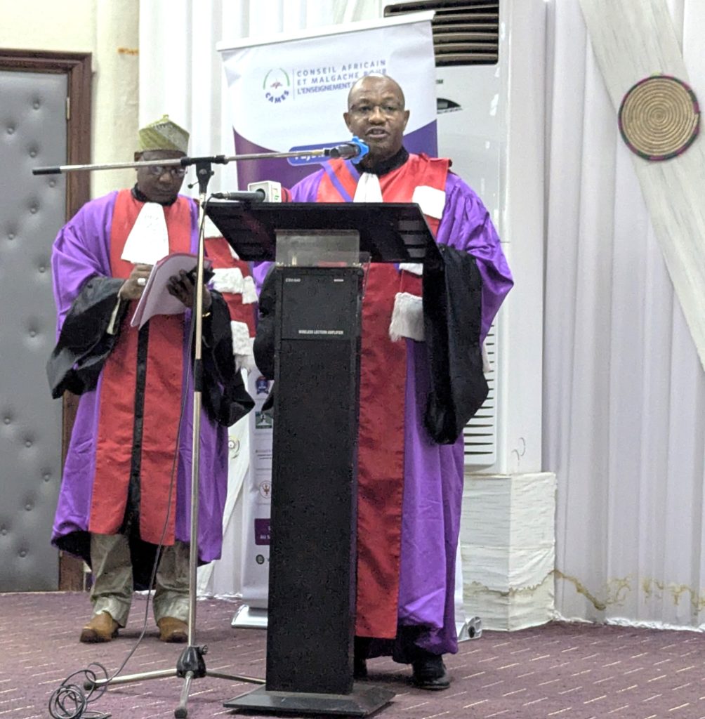 Le représentant des récipiendaires, Professeur Serge Théophile BALIMA, au nom des récipiendaires, a exprimé toute la satisfaction qui les anime, de recevoir ces distinctions honorifiques d’une Institution internationale de référence en matière d’évaluation scientifique tant pour les Enseignants-chercheurs que pour les Chercheurs. Il a fini ses propos par des remerciements à l’endroit des autorités du CAMES, du Ministre de l’Enseignement supérieur, de la Recherche et de l’Innovation, des acteurs du monde universitaire et des Institutions partenaires.