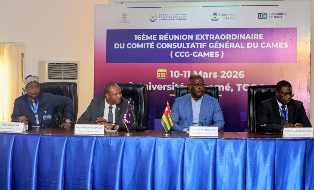 𝐋𝐨𝐦𝐞́ 𝐚𝐛𝐫𝐢𝐭𝐞 𝐥𝐚 𝟏𝟔𝐞̀𝐦𝐞 𝐑𝐞́𝐮𝐧𝐢𝐨𝐧 𝐞𝐱𝐭𝐫𝐚𝐨𝐫𝐝𝐢𝐧𝐚𝐢𝐫𝐞 𝐝𝐮 𝐂𝐨𝐦𝐢𝐭𝐞́ 𝐂𝐨𝐧𝐬𝐮𝐥𝐭𝐚𝐭𝐢𝐟 𝐆𝐞́𝐧𝐞́𝐫𝐚𝐥 𝐚̀ 𝐋𝐨𝐦𝐞́La 16ème Réunion extraordinaire du Comité Consultatif Général du CAMES (CCG CAMES) s’est tenue les 10 et 11 mars 2026 à l’Université de Lomé au Togo. Rencontre statutaire qui regroupe les Responsables d'Institutions d’Enseignement supérieur et de Recherche ainsi que les Directeurs en charge de l’Enseignement supérieur et de la Recherche désignés par leurs pays respectifs, le Comité Consultatif Général est l'Instance d’appui conseil et de supervision du CAMES.La cérémonie officielle d’ouveture de cette rencontre s’est tenue le 10 mars sous la présidence du Ministre délégué chargé de l’Enseignement supérieur et de la Recherche scientifique de la République du Togo, Pr Gado TCHANGBEDJI.Elle a vu la présence du Secrétaire Général du CAMES, Pr Souleymane KONATÉ, du Président par intérim du Comité Consultatif Général, Pr Gérard GRESENGUET, de la Directrice de cabinet du Ministre de l’Enseignement supérieur et de la Recherche scientifique, du Directeur des Programmes en charge des Comités Consultatifs Interafricains, Pr Ali DOUMMA, du Président de l’Université de Lomé, Pr Kossivi HOUNAKÉ, de la Présidente de l’Université de Kara, Pr Grâce Prénam HOUZOU-MOUZOU, des Vice-présidents, Doyens et Directeurs de l’Université de Lomé et d’éminents représentants des pays de l’espace CAMES.Deux jours durant, l’Université de Lomé a abrité les échanges qui ont porté sur la mise en œuvre des Programmes statutaires du CAMES notamment le 22ème Concours d’Agrégation des Sciences Juridiques, Politiques, Économiques et de Gestion, la 47ème session des Comités Consultatifs Interafricains, la session spéciale et la 40ème session du Programme Reconnaissance et Équivalence des Diplômes ( PRED).Le bilan à date du Plan Stratégique de Développement 2024-2028 a également été déroulé aux participants.L'Académie Virtuelle du CAMES (AVI CAMES) ainsi que la Stratégie de redynamisation de la Recherche dans l’espace CAMES ont également nourri les échanges. Avis, recommandations pointues et validations ont été partagés par les illustres membres de cette Instance de supervision, qui précède la session du Conseil des Ministres par les dossiers qui y sont validés avant d’y être présentés. ... See MoreSee Less