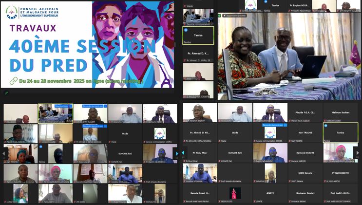 La 40ème Session du Programme Reconnaissance et Équivalence des Diplômes (PRED) a été officiellement lancée, en ligne, ce 24 novembre 2025. La cérémonie d’ouverture s’est déroulée sous la présidence du Directeur des Programmes en charge de l’Assurance Qualité, de la Recherche et du Partenariat, Professeur Saturnin ENZONGA YOCA, représentant le Secrétaire Général du CAMES. Etaient également présents, les Présidents et membres des trois Commissions spécialisées de la session d’accréditation, ainsi que des membres du Secrétariat général du CAMES.