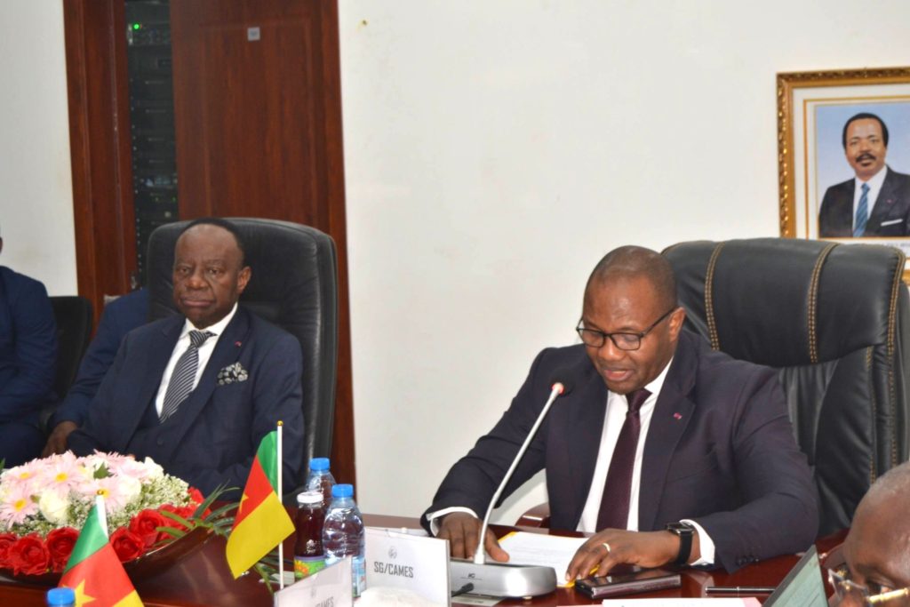 À sa suite, le Secrétaire Général du CAMES, Pr Souleymane KONATÉ, après avoir remercié les plus hautes autorités du Cameroun pour le soutien constant, et le Ministre d’État pour sa contribution inestimable, a rappelé le lien historique entre le Cameroun, pays membre fondateur et le CAMES. Il a exprimé ses remerciements et la reconnaissance de l’Institution pour cette initiative qui contribuera à « renforcer les capacités des Commissions Institutionnelles Locales, sur les préparations des candidatures aux CCI, aux Concours d’Agrégation, et à l’utilisation du Guide d’Évaluation des Enseignants-chercheurs et Chercheurs du CAMES ; cela dans le cadre d’une démarche qualité, visant à l’amélioration continue des performances des IESR du Cameroun aux différents programmes d’évaluation du CAMES ».
