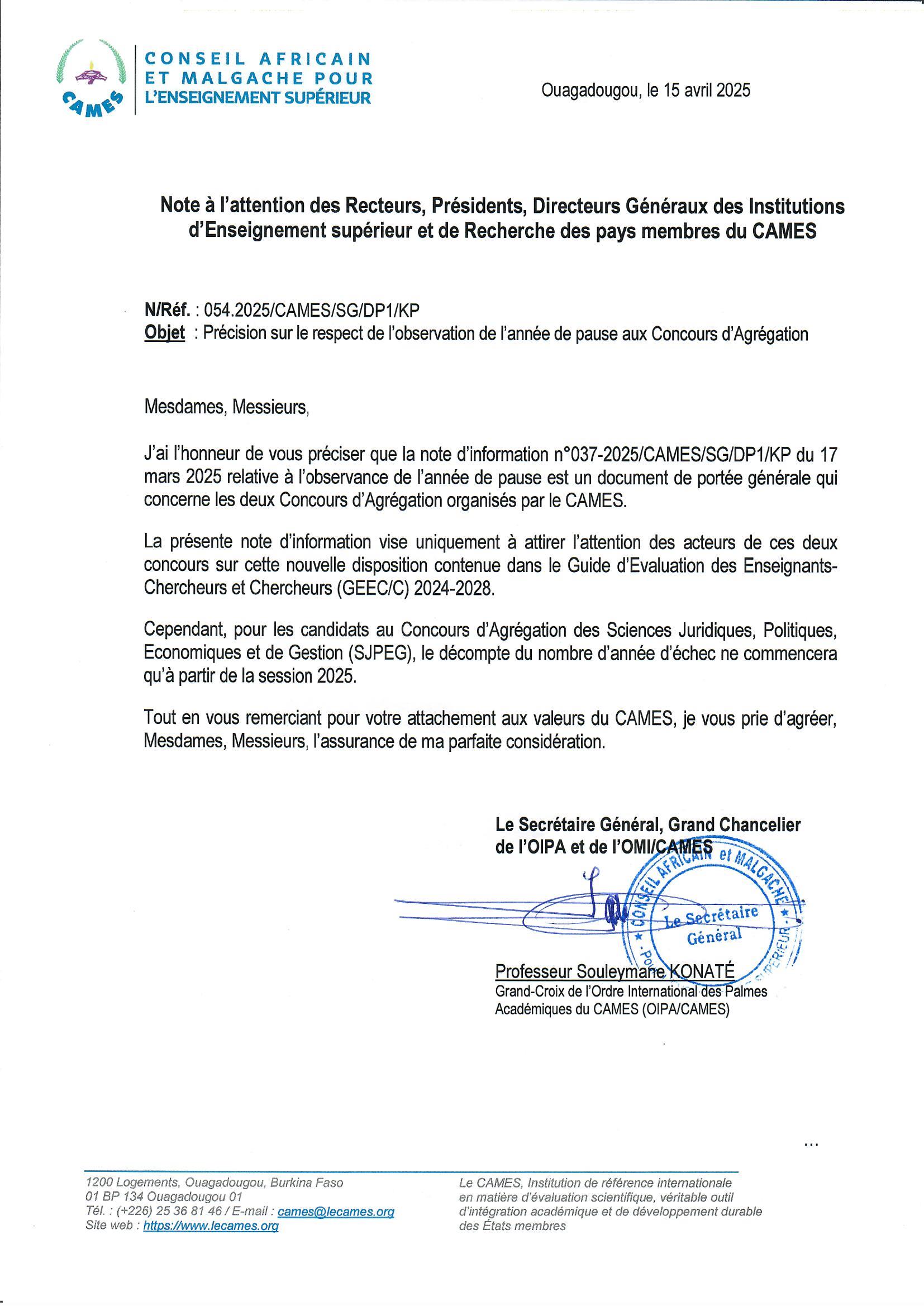 La note d’information n°037-2025/CAMES/SG/DP1/KP du 17 mars 2025 relative à l’observance de l’année de pause est un document de portée générale qui concerne les deux Concours d’Agrégation organisés par le CAMES.