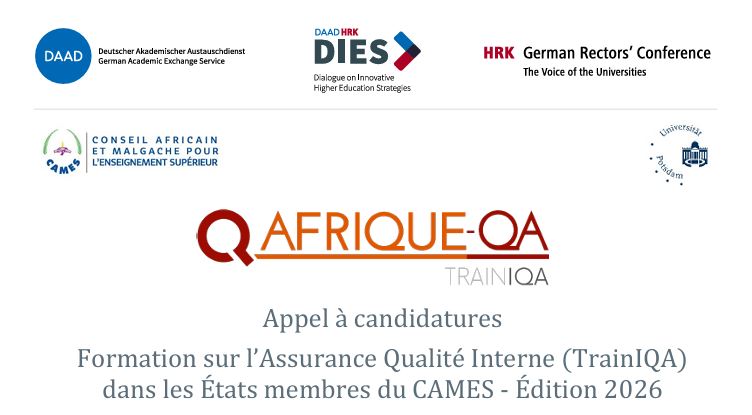 L’Office allemand d’échanges universitaires (DAAD), la Conférence des Recteurs d’Université d’Allemagne (HRK), le Conseil Africain et Malgache pour l’Enseignement Supérieur (CAMES) et l’Université de Potsdam (UP), située en Allemagne, ont lancé un appel conjoint à candidatures pour la formation « DIES Training on Internal Quality Assurance (TrainIQA) » dans les États membres du CAMES. TrainIQA fait partie du programme Dialogue on Innovative Higher Education Strategies (DIES) dont l’objectif est de renforcer les outils et processus de gestion dans les établissements d’enseignement supérieur des pays en développement.