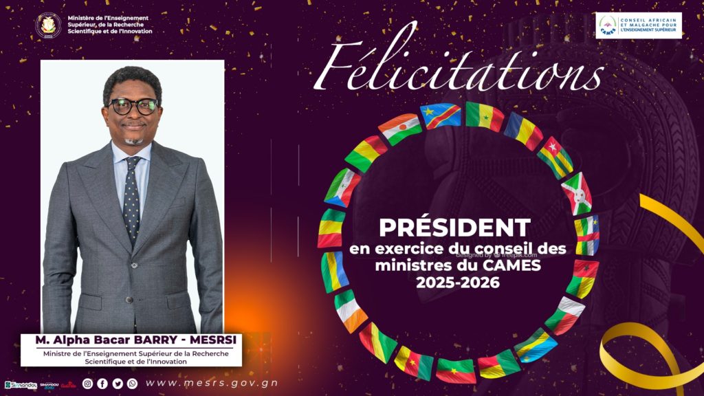 La réunion du Comité des Experts dans le cadre de la 42ème session ordinaire du Conseil des Ministres du Conseil Africain et Malgache pour l’Enseignement Supérieur – CAMES, s’est ouverte le lundi 19 mai 2025, à l’hôtel Radisson Blu de Conakry. La cérémonie officielle d’ouverture a été présidée par Monsieur Alpha Bacar BARRY, Ministre guinéen de l’Enseignement supérieur, de la Recherche scientifique et de l’Innovation, en présence du Secrétaire Général du CAMES, Professeur Souleymane KONATÉ et du Secrétaire Général du Ministère de l’Enseignement supérieur, Dr Facinet CONTÉ.