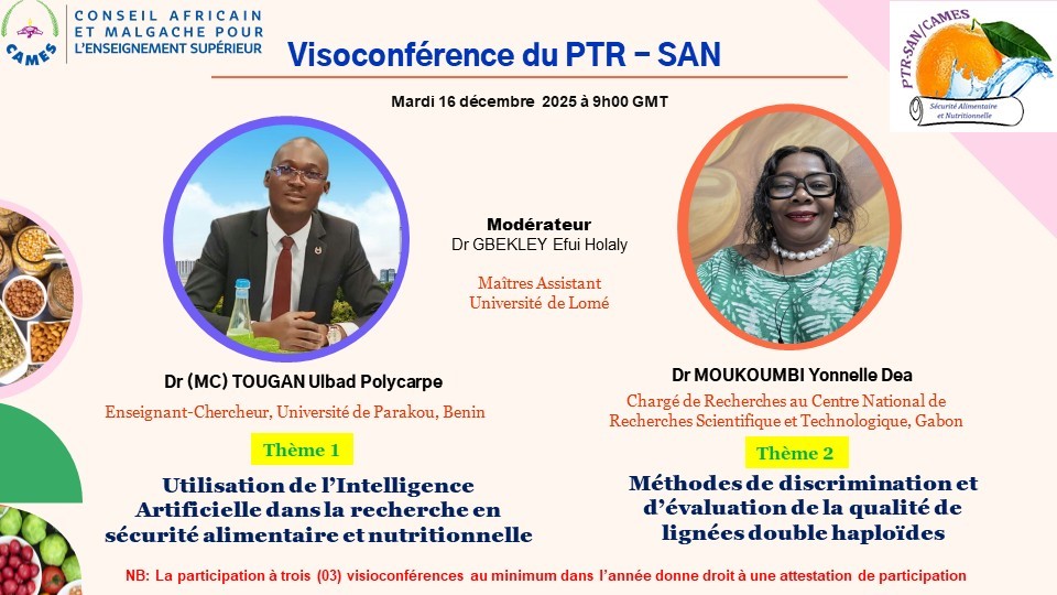 Le Programme Thématique de Recherche sur la Sécurité Alimentaire et Nutritionnelle (PTR-SAN) a organisé le mardi le 16 décembre 2026 à 9h GMT, une visioconférence scientifique en présence d’Enseignants-chercheurs, de Chercheurs et d’étudiants autour de problématiques scientifiques actuelles.